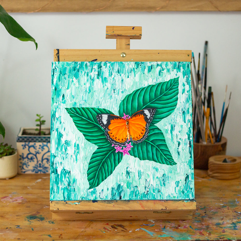 An orange Lacewing Butterfly rests on lush green leaves. Watch the creation of this painting here.